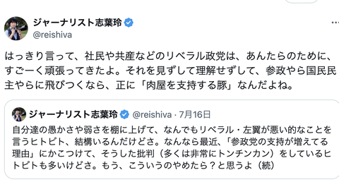 【悲報】ジャーナリスト「リベラル政党はあんたらのために頑張ってきた。参政やら国民やらに飛びつくなら肉屋を支持する豚」