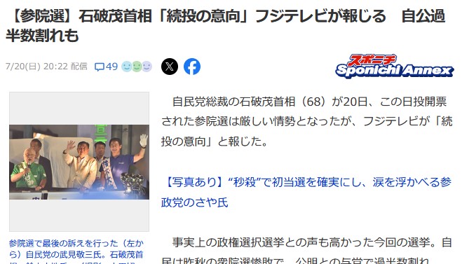 【参院選】石破茂首相「続投の意向」フジテレビが報じる 自公過半数割れも