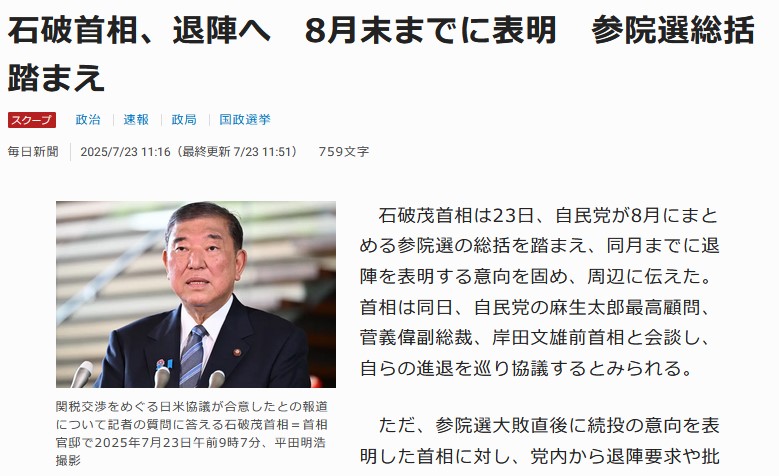 毎日新聞「石破首相、退陣へ 8月末までに表明」