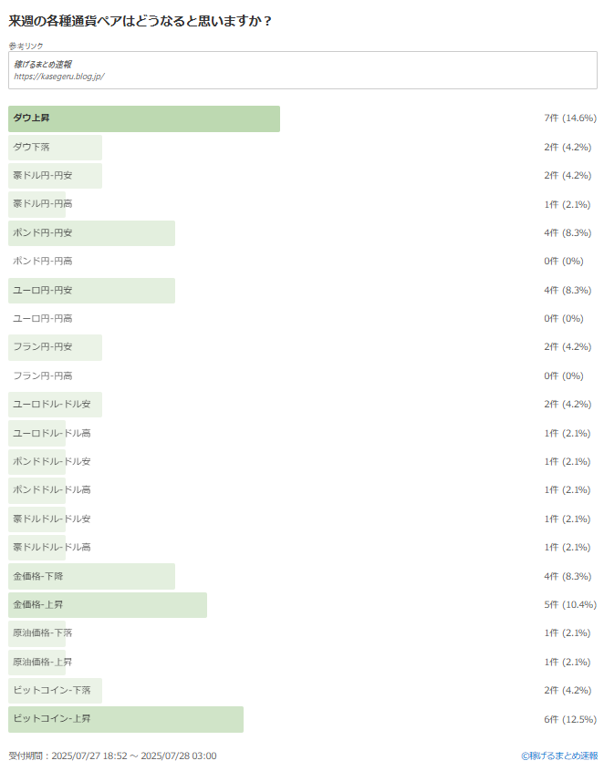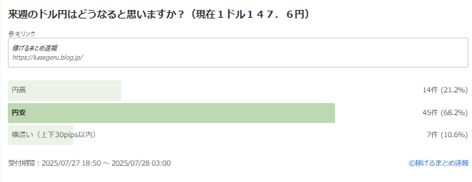 前回のアンケート記事、やる夫が「先週のオープン時は1ドル148.8円→クローズ時は147.6円、円安予想多数で結果は残念ながら外れ」と書いてあるんですが、なぜか「当たった時だけそのように見せている悪質サイト」という書き込みがありましたね