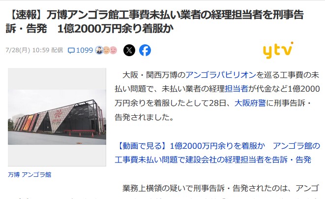 万博アンゴラ館工事費未払い問題、工事を担当した「一六八建設」の経理が着服してただけだった模様 着服のせいで下請け業者に代金支払えず