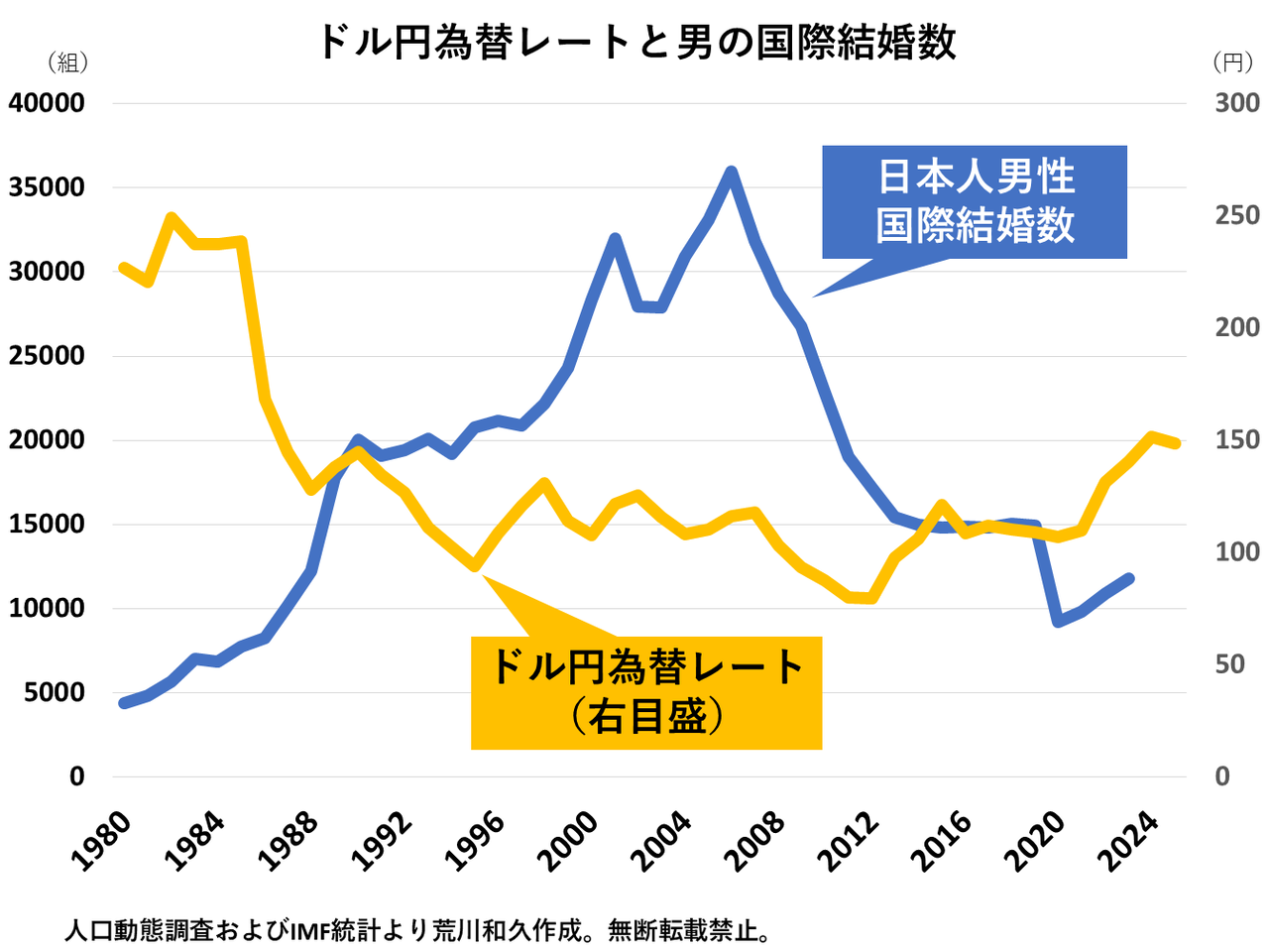 1980年からの為替レートの推移と国際結婚数の推移を見ると、円高になれば国際結婚が増え、円安になれば減るという強い相関がある。