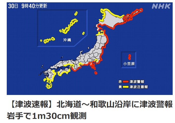 【津波】北海道~和歌山沿岸に津波警報 岩手県では1m30cm観測 カムチャッカ半島付近で巨大地震【詳しく】 | NHK | 地震