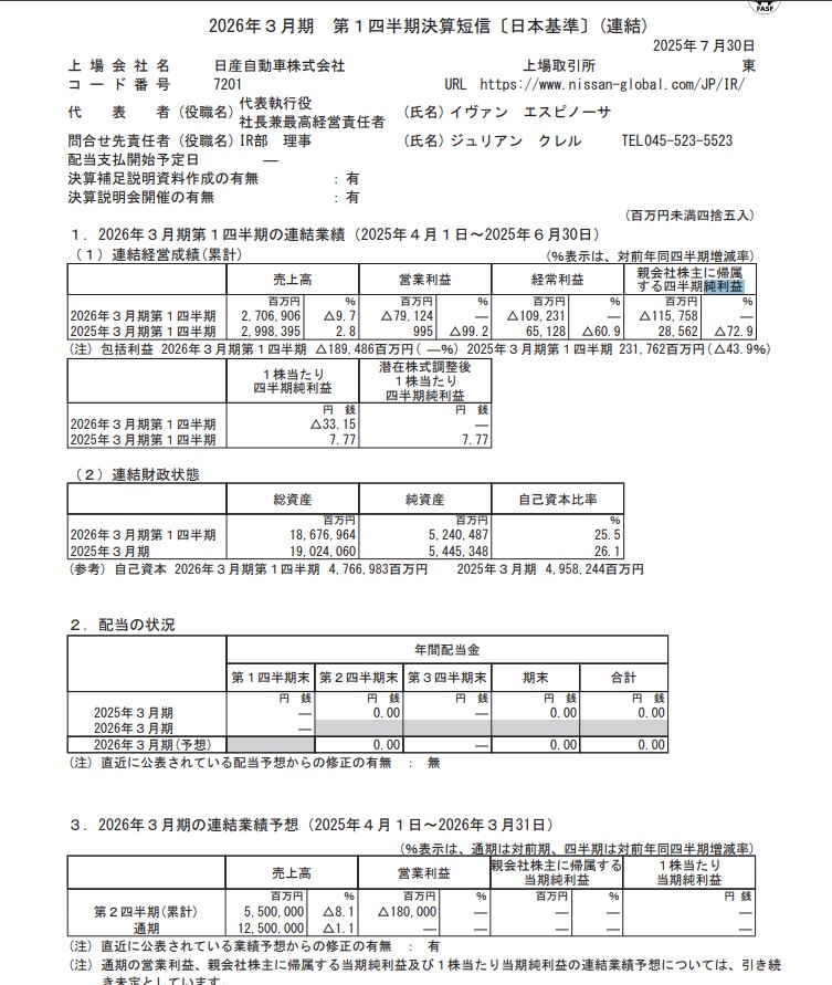 日産自動車の2025年4~6月期決算、1157億円の赤字 通期業績予想は非開示