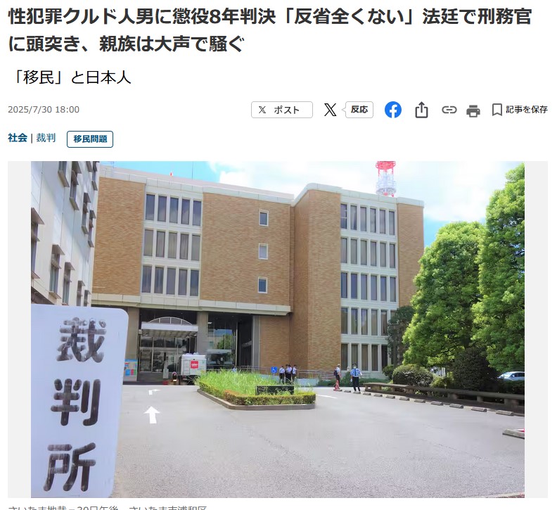 性犯罪クルド人男に懲役8年判決「反省全くない」法廷で刑務官に頭突き、親族は大声で騒ぐ