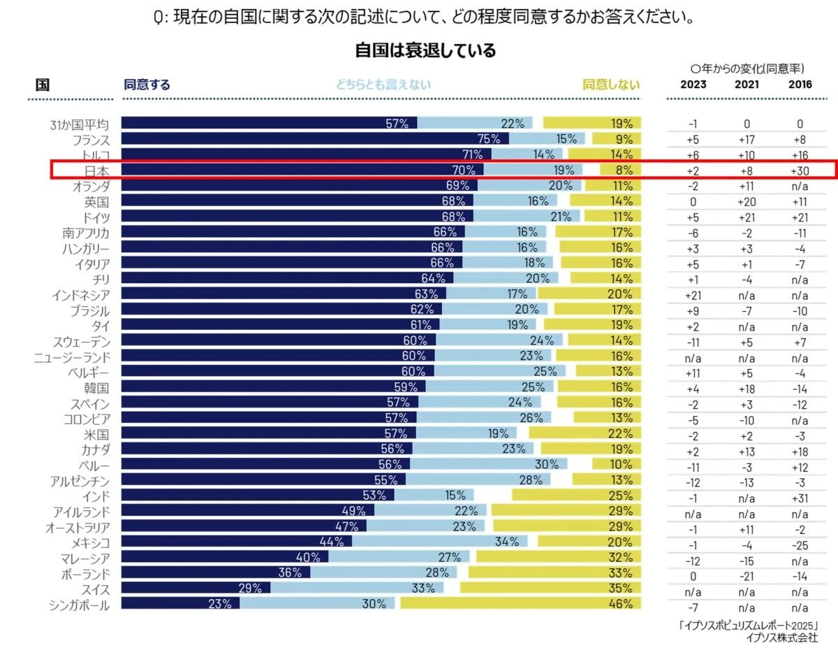 ■日本は3位、“自国の衰退”を感じる国民は70%に