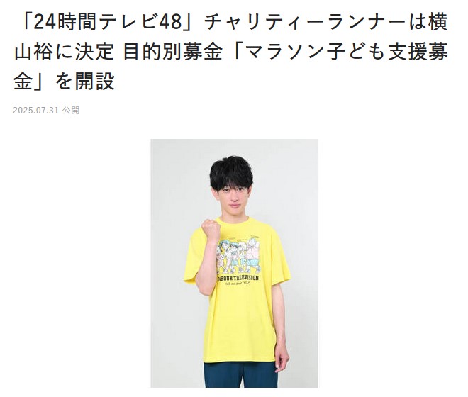 『24時間テレビ』横山裕、チャリティーランナーに決定「少しでも力になれたら」 「子ども支援募金」開設