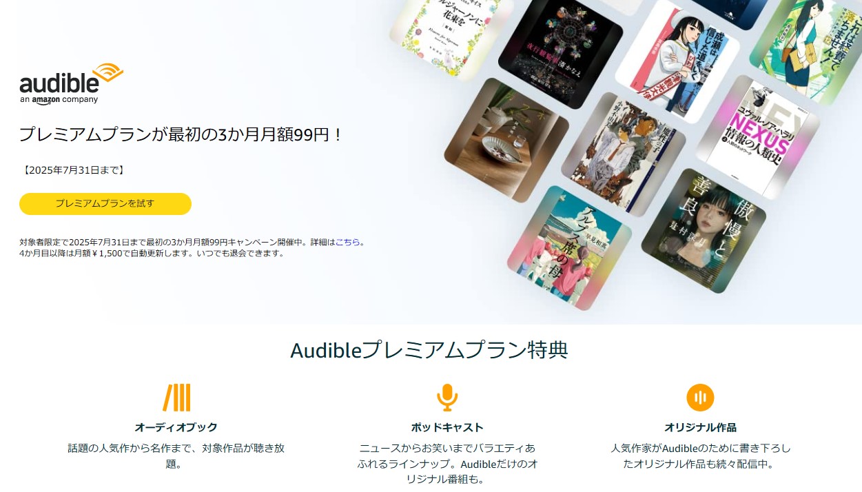 Audible プレミアムプラン3ヶ月無料体験キャンペーン(7/31まで)