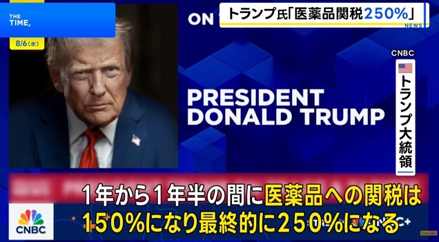 トランプ「医薬品の関税は1年~1年半以内に150%、最終的に250%になる」「半導体関税は近日発表」「インドへの関税は24時間以内に大幅引き上げ」