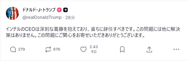 【速報】インテルは時間外一時3%超急落 トランプ米大統領、インテルCEOに辞任要求