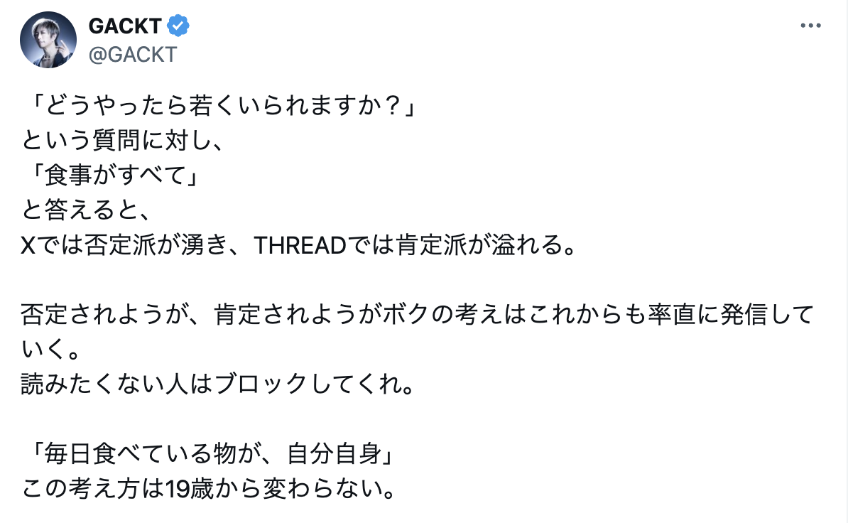 GACKTは6日、Xで若さを保ち続ける秘訣について「食事がすべて」と私見を述べ、「薬の摂取をやめ、食生活を見直してから、一年でカラダの状態が劇的に変わった」と自身の経験を記すとともに、「老ける人、太る人、肌が荒れる人、体調が悪い人、病気の人は、一度本気で真剣に普段自分がどんな物を口にしているかを調べ見直すべき。先進国でガンが増え続けているのは日本だけ。日本の医学はこれだけ進歩しているのにも関わらずだ。世界的に見ても明らかにおかしい」と持論を展開していた。