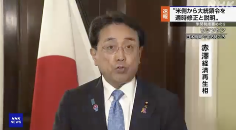 赤澤経済再生担当大臣は訪問先のワシントンで「相互関税に関するアメリカ側の内部の事務処理で日米間の合意に沿っていない内容の大統領令が発出され、適用が開始されたことは極めて遺憾だ」と述べました…