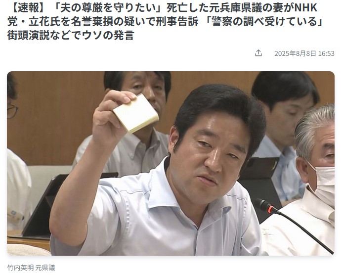 自殺した竹内英明元兵庫県議の妻、NHK党立花氏を名誉棄損の疑いで刑事告訴 街頭演説などで「警察の調べ受けている」とウソの発言