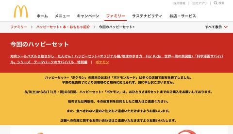 関連:【悲報】ハッピーセット「ポケモン」カード多くの店舗で配布終了「予想を上回る売れ行きのため」 : IT速報