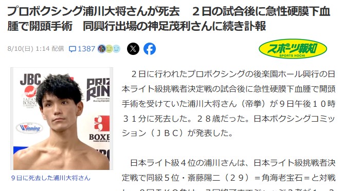 プロボクシング浦川大将さんが死去 2日の試合後に急性硬膜下血腫で開頭手術 同興行出場の神足茂利さんに続き訃報