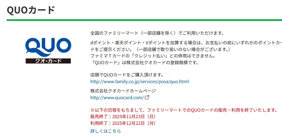 【緊急】ファミリーマート、2025年12月22日でQUOカードの利用を終了 11月23日には販売を終了