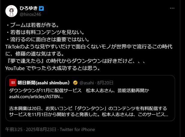 ひろゆき「ダウンタウンチャンネルは修羅の道な気はする」「若者は有料コンテンツ見ない。YouTubeでやったら大成功するとは思う」