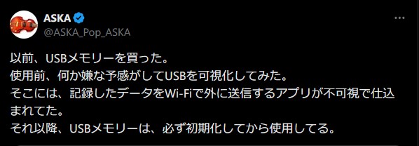ASKA「買ったUSBメモリーを可視化してみたら、記録したデータをWi-Fiで外に送信するアプリが不可視で仕込まれてた」