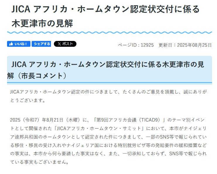 千葉県・木更津市、「ナイジェリアからの移民受け入れ、特別就労ビザ等の発給要件の緩和措置」報道を完全否定 SNS騒動化に市長名義で声明