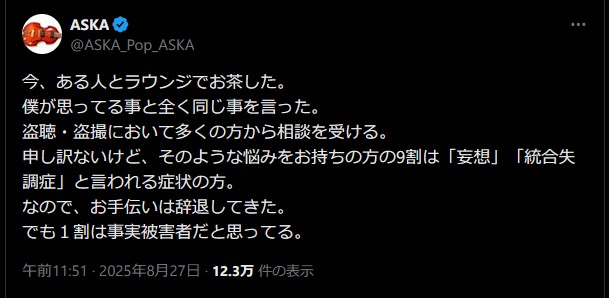 ASKA「盗聴・盗撮において多くの方から相談を受ける。そのような悩みをお持ちの方の9割は『妄想』『統合失調症』と言われる症状の方」