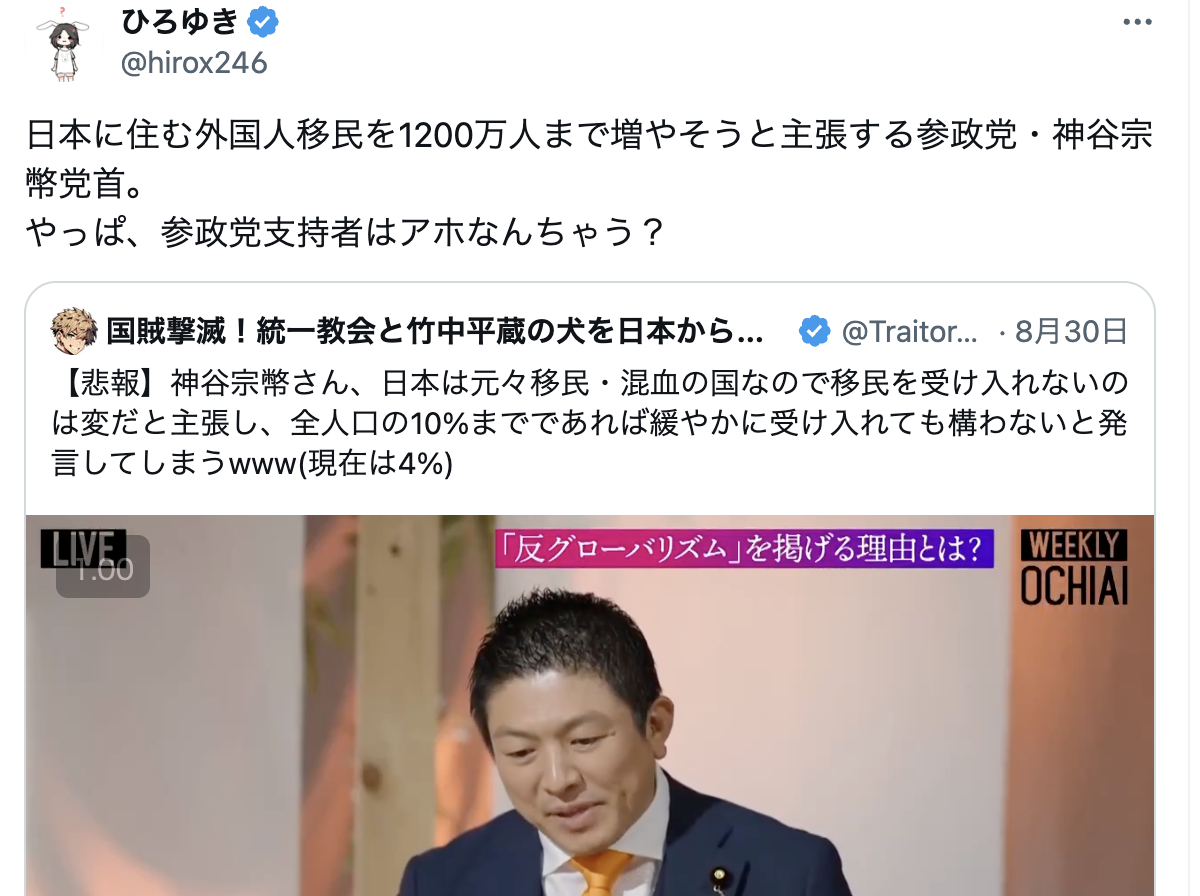 やっぱ、参政党支持者はアホなんちゃう? https://t.co/LdZz6sudnI— ひろゆき (@hirox246) August 30, 2025