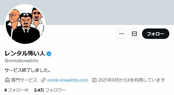 「レンタル怖い人」の公式X(旧ツイッター)が31日に更新され、突然サービス終了を発表した。