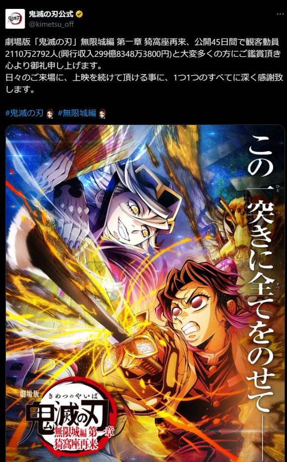 劇場版「鬼滅の刃」無限城編 第一章 猗窩座再来、公開45日間で観客動員2110万2792人(興行収入299億8348万3800円)と大変多くの方にご鑑賞頂き心より御礼申し上げます。