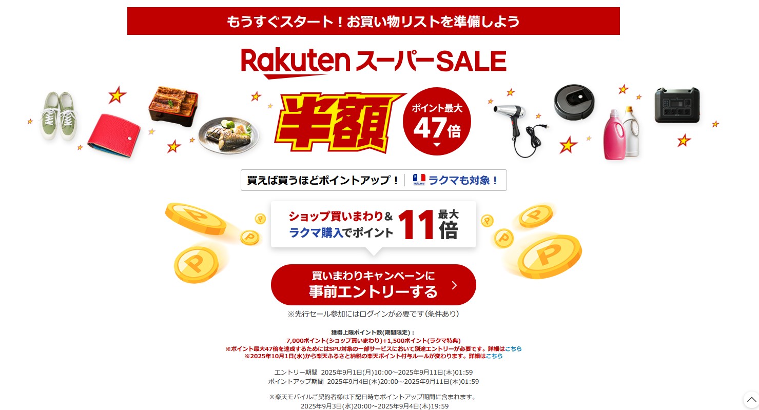 09/04 20:00:00 – 09/11 01:59:59 楽天スーパーSALE