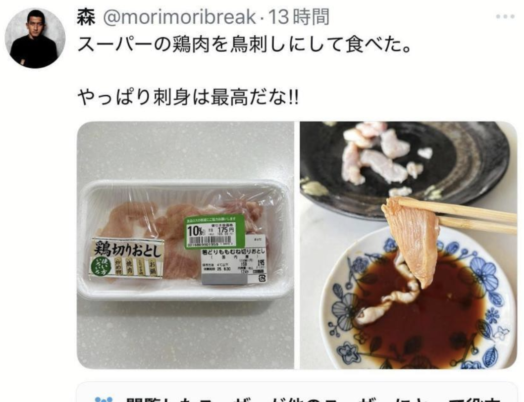 そんな森さんだが、8月29日にXで「スーパーの鶏肉を鳥刺しにして食べた。やっぱり刺身は最高だな!!」とつづり、鶏肉のパックと、薄切りにした生の鶏肉を醤油につけて箸で掴んでいる写真を公開した。
