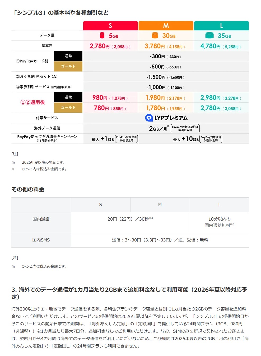 ワイモバイル、新料金プラン「シンプル3 S/M/L」を発表 基本料金値上げも割引増額