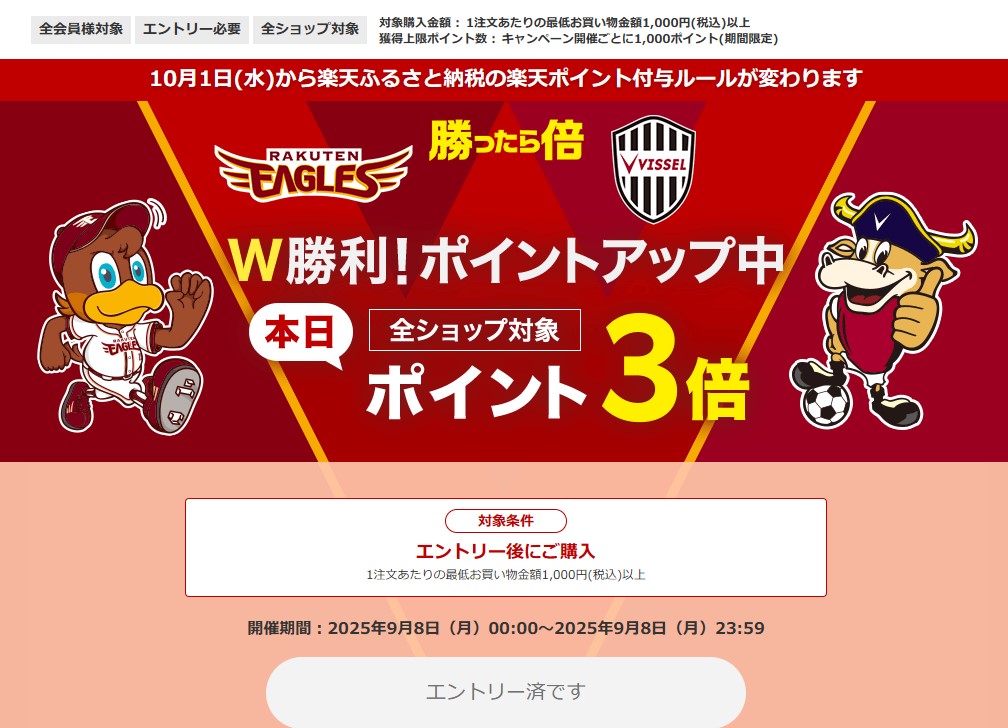 楽天スーパーSALE、野球・サッカーW勝利ポイント3倍を開始