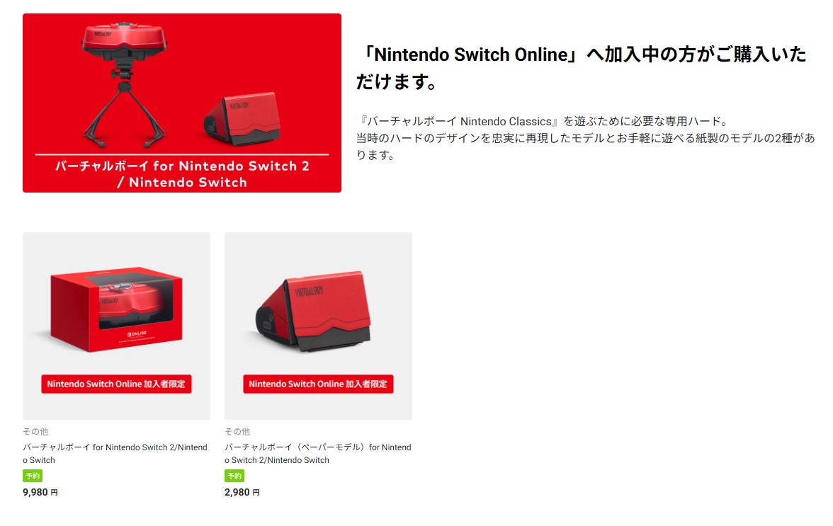 バーチャルボーイ for Nintendo Switch販売開始 価格は通常版が9980円 ペーパーモデルが2980円