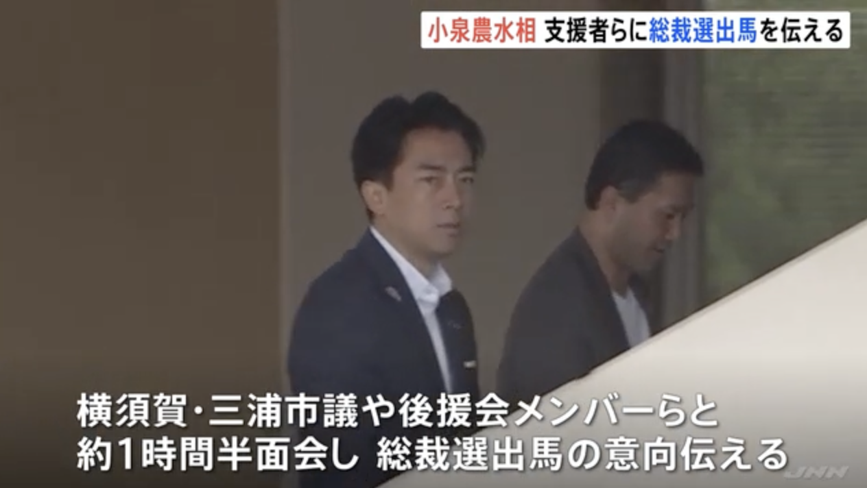 「小泉氏が到着しました。これから支援者らに出馬の意向を伝えるものとみられます」小泉氏はきょう午前、地元である神奈川県横須賀市や三浦市の市議会議員、自らの後援会メンバーらとおよそ1時間半、面会し、この席で総裁選への出馬の意向を伝えました…