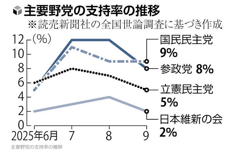 野党支持率、国民民主がトップに返り咲き 国民民主9% 参政党8% 立憲民主5%