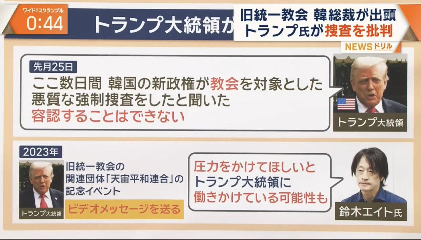 トランプ大統領、統一教会の韓鶴子総裁を擁護し捜査を批判「韓国の新政権が教会に悪質な強制捜査をしたと聞いた。容認することはできない」