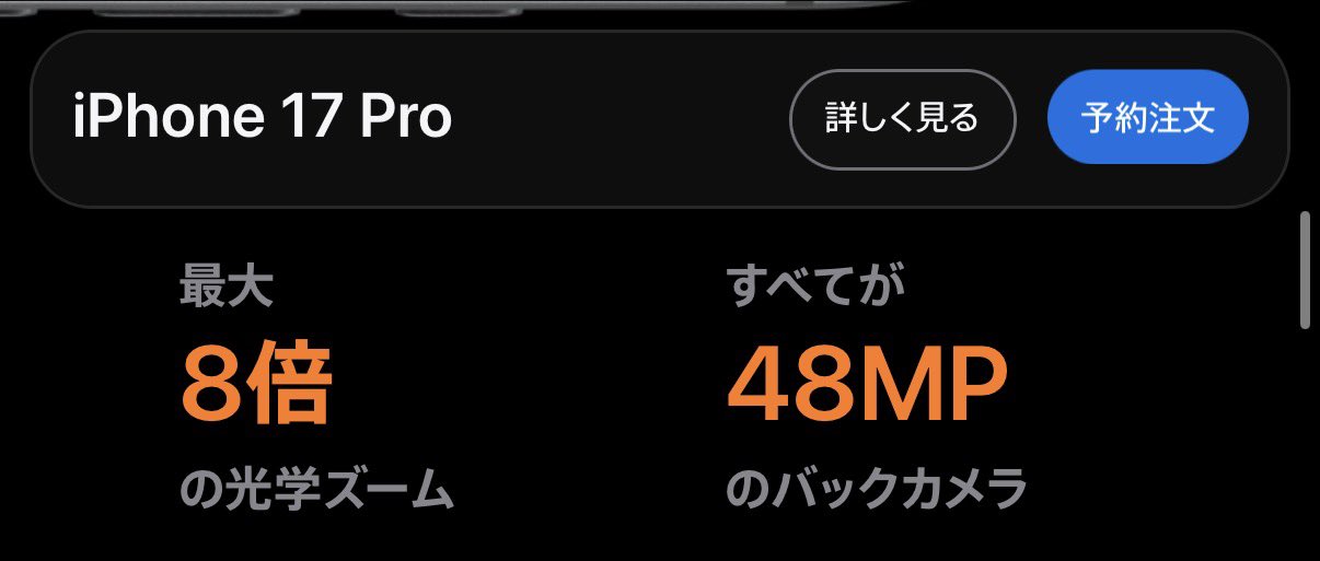 Apple Japan、「iPhone 17 Pro/17 Pro Max」のカメラ「8倍光学ズーム」表記を「光学品質ズーム」に修正
