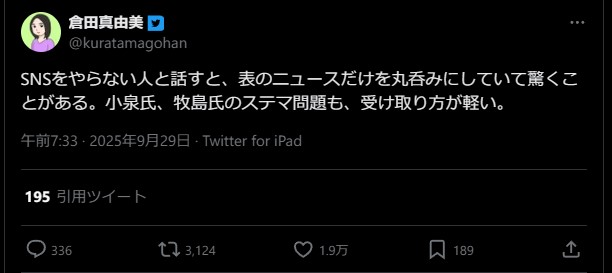 SNSをやらない人と話すと、表のニュースだけを丸呑みにしていて驚くことがある。小泉氏、牧島氏のステマ問題も、受け取り方が軽い。