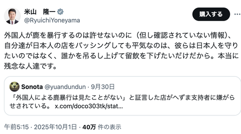 米山氏は、番組でインタビューに応じた男性の経営する飲食店のネット口コミが荒らされていると伝えた一般ユーザーの投稿を引用。「外国人が鹿を暴行するのは許せないのに(但し確認されていない情報)、自分達が日本人の店をバッシングしても平気なのは、彼らは日本人を守りたいのではなく、誰かを吊るし上げて留飲を下げたいだけだから」と私見を述べ、「本当に残念な人達です」とつづった。