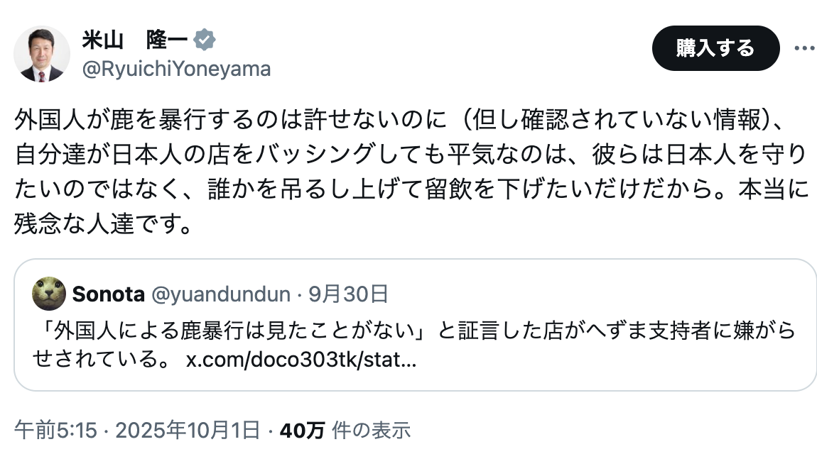 米山隆一「外国人が鹿を暴行するのは許せないのに、自分達が日本人の店をバッシングしても平気なのは、誰かを吊るし上げて留飲を下げたいだけだから。本当に残念な人達」