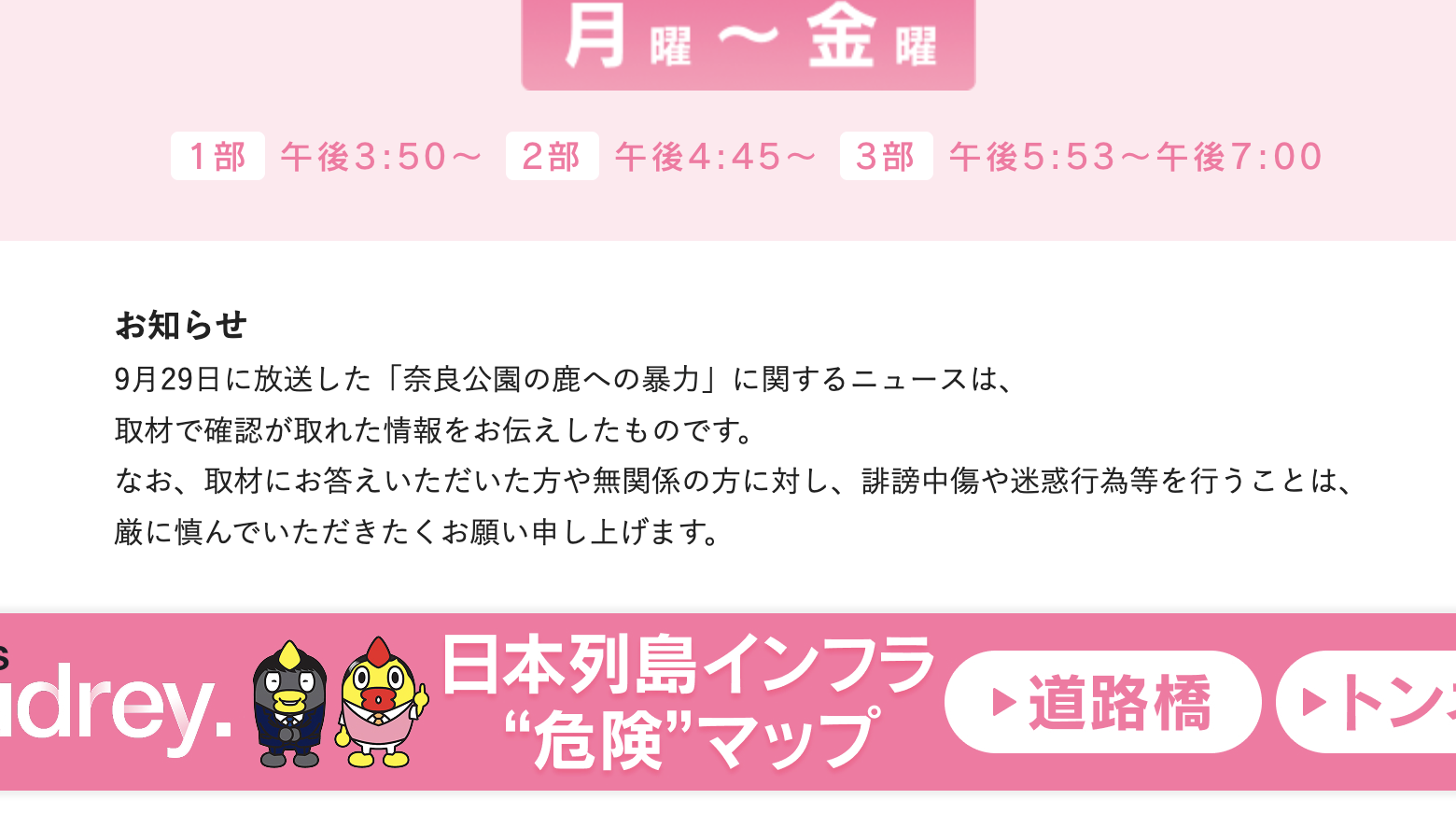 >日本テレビは2日、報道番組「news every.」で放送された奈良公園(奈良市)のシカを巡るVTRについて、