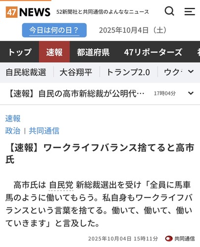高市早苗・新総理大臣「全員に馬車馬のように働いてもらう。ワークライフバランスという言葉を捨てる」