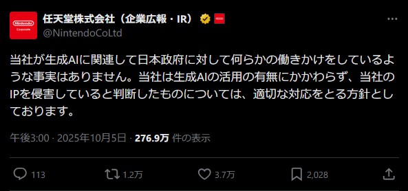 任天堂「当社が生成AIに関連して日本政府に対して何らかの働きかけをしているような事実はありません」