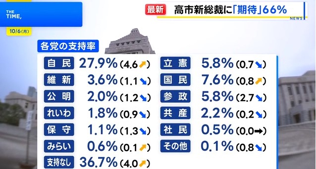 政党支持率調査、高市総裁になった自民党が4.6%上昇して27.9% 国民民主0.8%上昇 参政党は2.7%下落