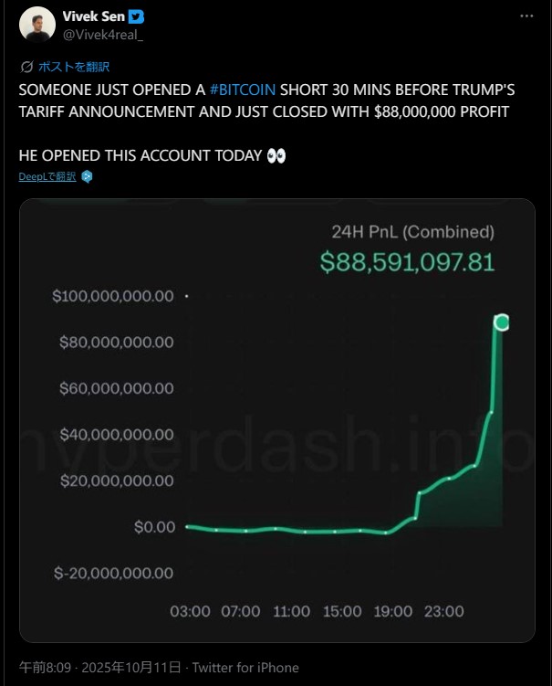 トランプが関税を発表する30分前にビットコインを大きくショートして8800万ドル(約133億円)儲けたアカウントあり。そして、そのアカウントは今日開設。春からトランプ関税でインサイダー取引がばんばん行われているが、政権関係者のためかお咎め一切なし。
