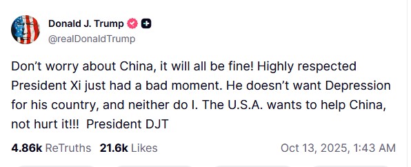 中国のことは心配しないで、きっと大丈夫!尊敬されている習近平国家主席は、今まさに最悪の状況に陥った。彼は自国が不況に陥ることを望んでいない。私も同じだ。アメリカは中国を助けたいのであって、傷つけたいのではない!DJT大統領