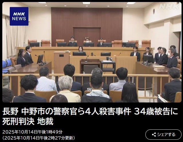 長野・中野市の警察官ら4人殺害事件 34歳の被告に死刑判決 長野地裁(14:09)