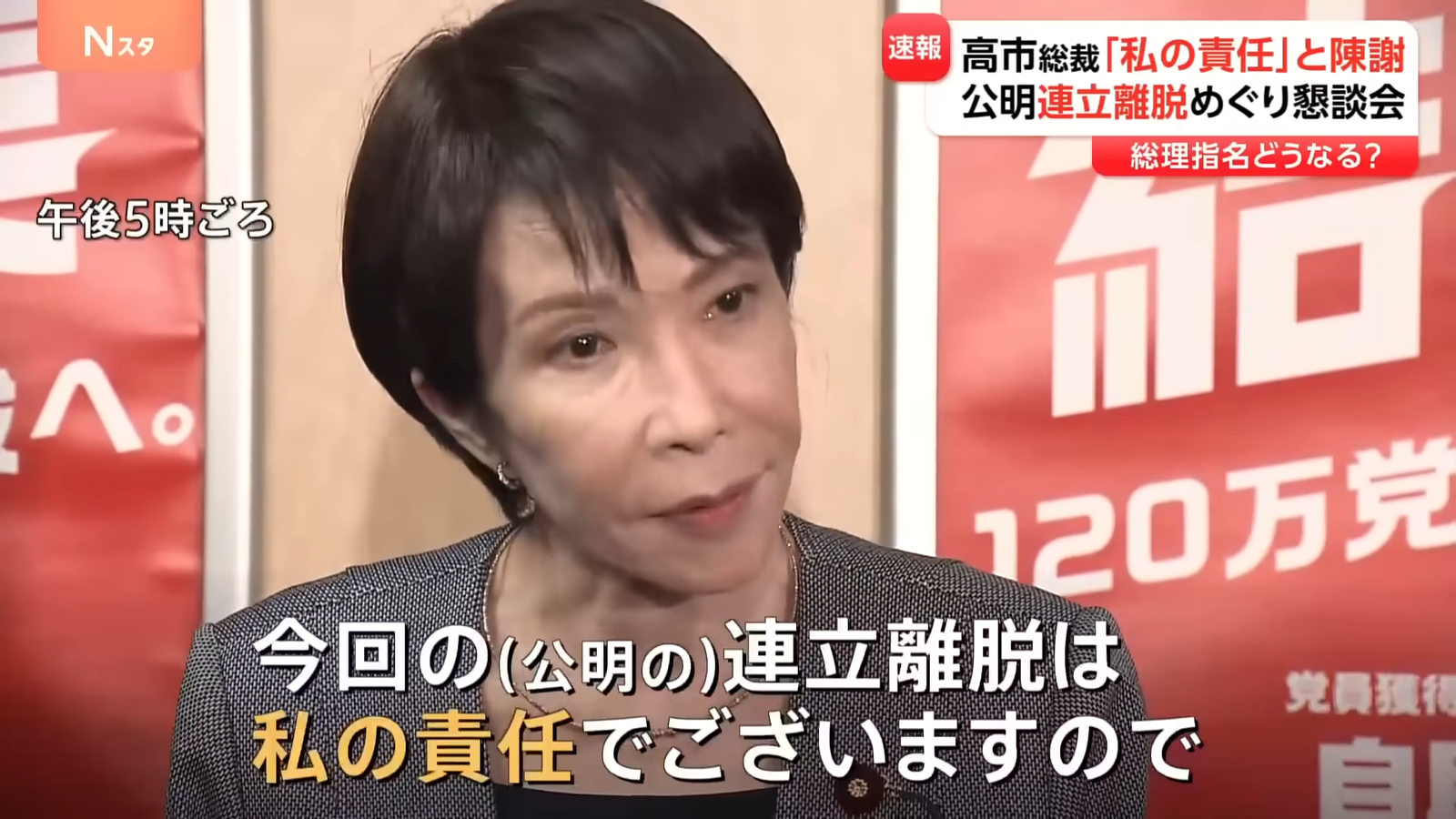 自民党の高市早苗総裁は14日、公明党の連立政権離脱を巡り、党両院議員懇談会で「私の責任だ。おわび申し上げる」と陳謝した。終了後、高市氏が記者団に明らかにした。