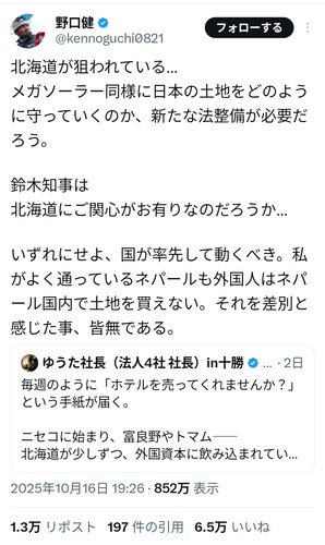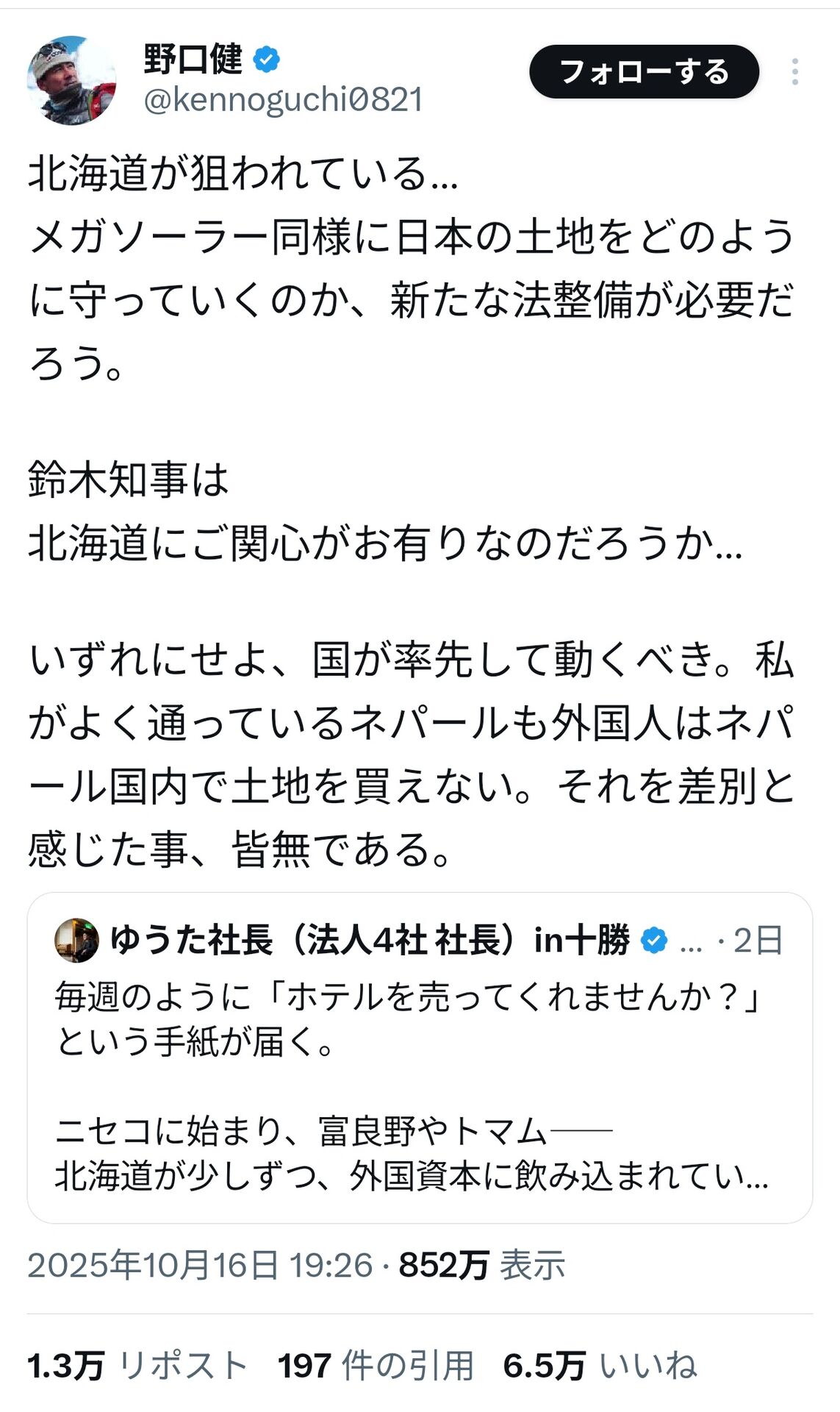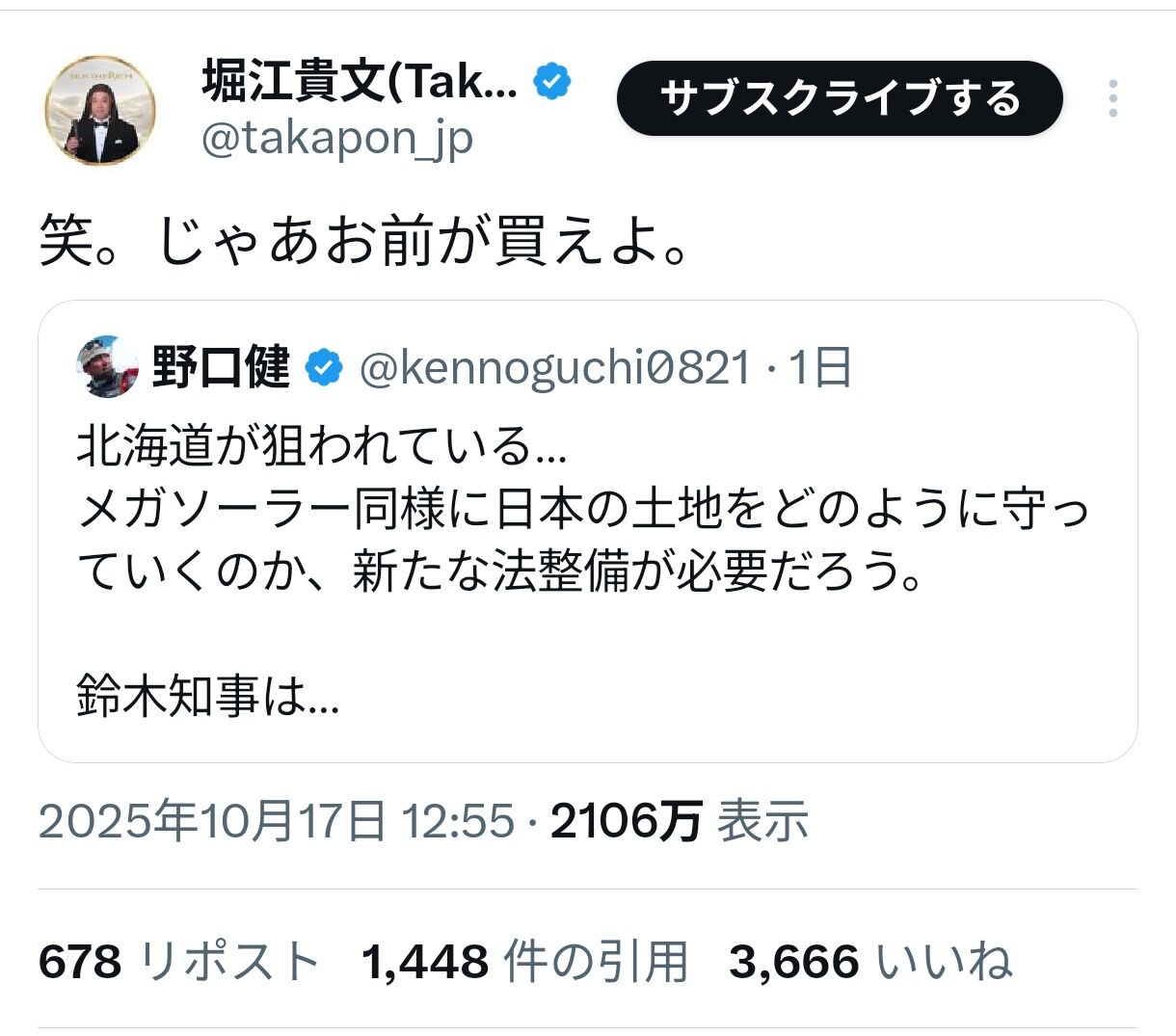 【炎上】野口健「北海道の土地が外国人に買い叩かれてる!」ホリエモン「じゃあお前が買えよ笑」
