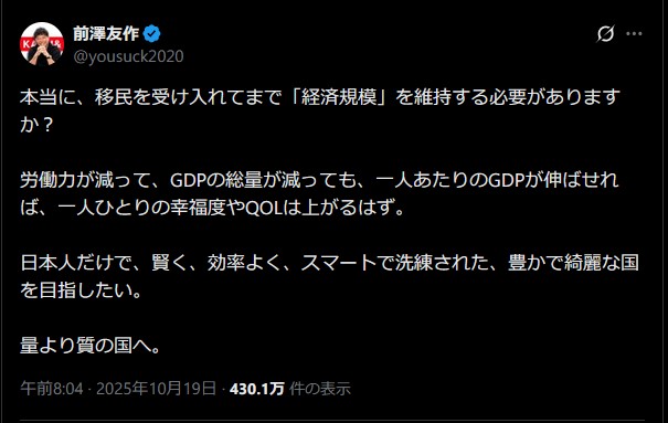 前澤友作氏「移民を受け入れてまで経済規模を維持する必要あります?」「日本人だけで豊かで綺麗な国を目指したい」「量より質の国へ」「経済成長=正義はもう古いかと」