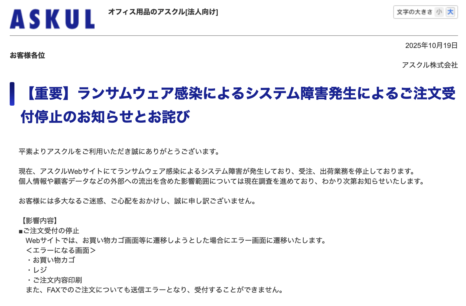 アスクル(本社、東京都江東区)は10月19日、ランサムウエア感染によるシステム障害が発生したと発表した。
